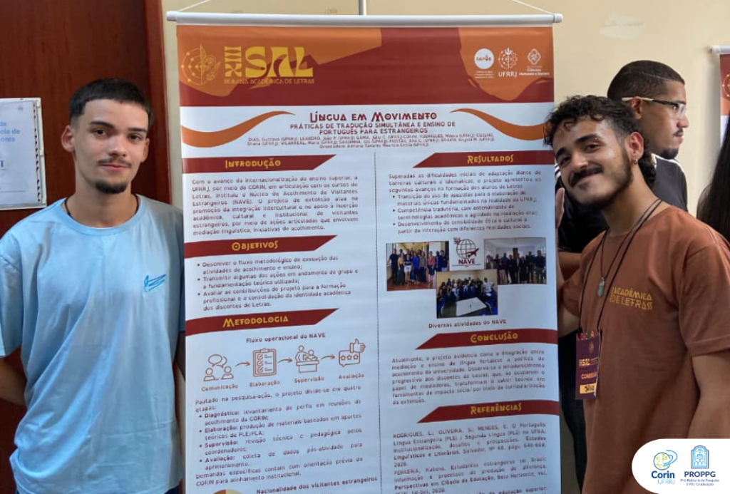 A apresentação foi realizada pelos discentes Júlio Gama, bolsista do projeto Comunica Corin (PDAI) e do NAVE, e Gustavo Dias, ambos do curso de Letras – Português/Inglês/Literaturas. O pôster foi desenvolvido em colaboração com os estudantes Milena Rodrigues e João Pedro Leandro, sob orientação da professora Adriana Lessa.